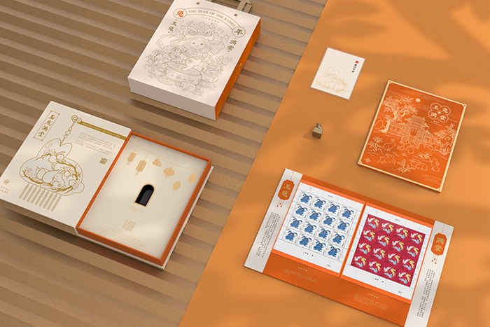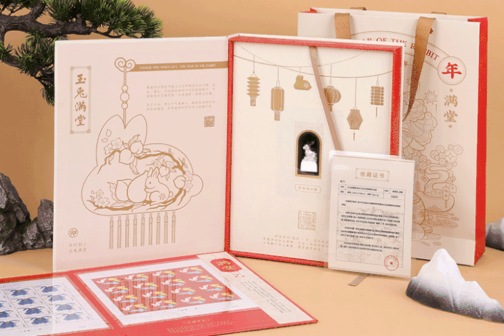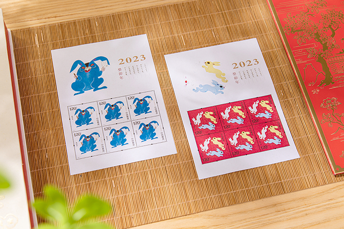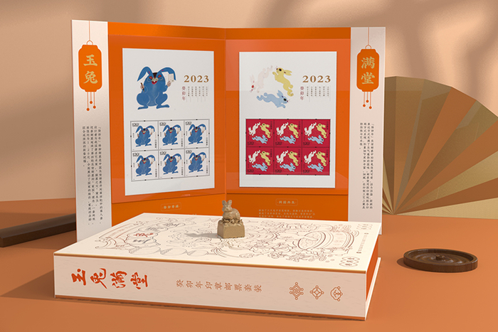 于是,我们联手西泠印社,向中国邮政预定了少量大小版《癸卯年》兔年生肖邮票,打造了这套2023《玉兔满堂》生肖印章邮票年礼 。