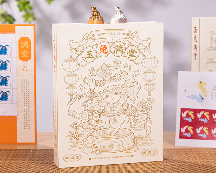 邮票册封面,屋檐前玉兔们或抬头望月,或双爪抓“钱”、或交头接耳,犹如满堂玉兔闹新春,热热闹闹过大年。