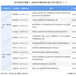 上游输水管道上市公司:青龙管业(002457.SZ)、顺控发展(003039.SZ)、国统股份(002205.SZ)、纳川股份(300198.SZ)、伟星新材(002372.SZ)等;水处理设备上市公司:巴安水务(300262.SZ)、和科达(002816.SZ)、京源环保(688096.SH)、力源科技(688565.SH)、楚环科技(001336.SZ)、中建环能(300425.SZ)等;水处理药剂上市公司:泰和科技(300801.SZ)、清水源(300437.SZ)、博芳环保(837879.OC)等;水质监测设备上市公司:力合科技(300800.SZ)、聚光科技(300203.SZ)、先河环保(300137.SZ)等。