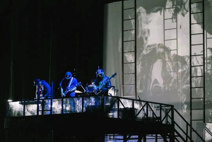在《空中花园谋杀案》,现场伴奏与现场演唱突破了舞台与观众席的界限,整个剧场都浸没在鲜活的节奏感之中。白色墙面、简单利落的线条、错落的阶梯仅仅是开场时现身的谜面,一切预料不到的巧思将随着情节铺展缓缓显露。