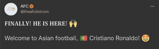 “创造历史!这次签约不仅会鼓舞我们俱乐部去取得更伟大的成功,同时也会鼓励我们的联赛、我们的国家、未来的年轻一代成为更好的自己。欢迎C罗来到自己的新家。”利雅得胜利在社交媒体上写道。
