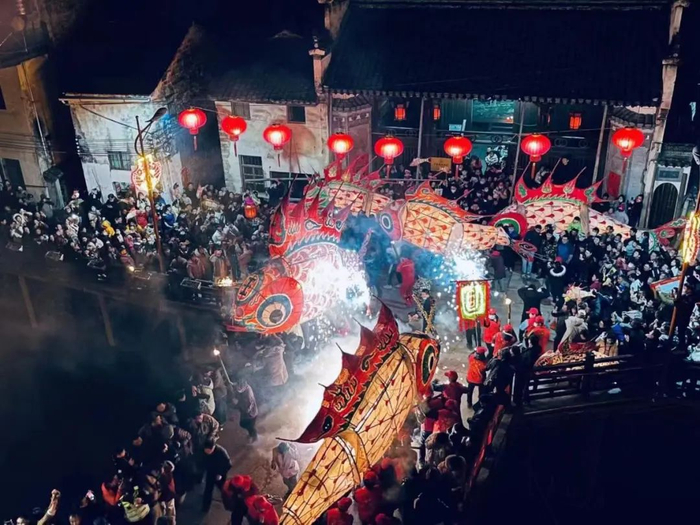 汪满田嬉鱼灯是徽州地区传承最悠久、保存最完好的传统年俗之一,距今已有600多年历史。每年元宵节,汪满田村民都会自发组织盛大的鱼灯会。人们成群结队,跟随鳞鳍闪烁的鱼灯队,拖出一条长长“尾巴”。此外,今年灯会还新增了一个仪式感满满的环节:在中心广场,每晚都会举行亮灯仪式,复刻古时上元节亮灯的盛况。