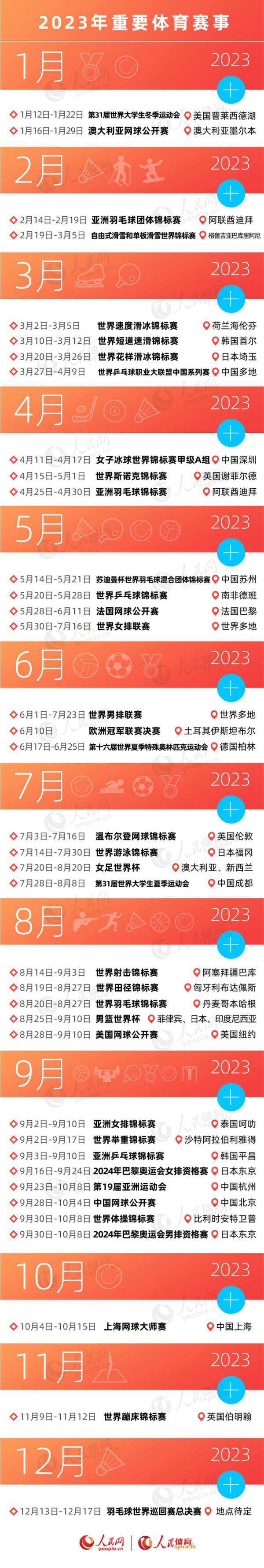 这,并不会影响重磅赛事纷至沓来,2023年依旧成为体育大年,体育迷们尽情享受观赛乐趣。受到疫情影响,此前延期举行的成都大运会、杭州亚运会将拉开帷幕,中国诚挚欢迎亚洲、全球的体育健儿展示风采;由澳大利亚和新西兰联合举办的女足世界杯,将于7月进行,上海巾帼名帅水庆霞将率铿锵玫瑰强势出击;此外,田径、游泳、乒乓球、短道速滑、花样滑冰等多个项目的单项世界锦标赛,也将接连上演。