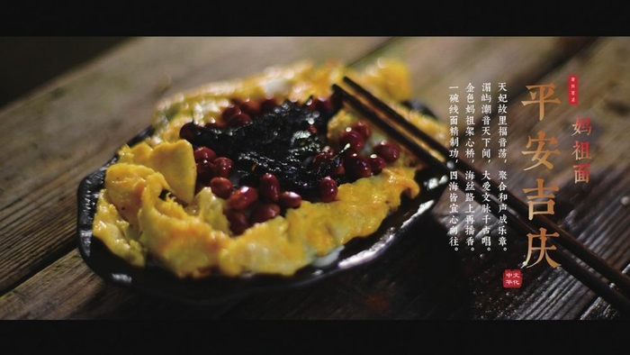 莆阳美食,大多自带故事体。如丝线般又细又长、韧性十足,配上颗粒饱满的花生米、咸香嫩滑的香菇、金黄的鸡蛋、酥脆鲜香的紫菜等,一碗妈祖面,吃的不仅是满足,更是平安。随着妈祖文化的不断传播,沿海人民便逐渐把象征“平安祥和”的这碗面称为“妈祖面”,而它也成为莆田人为亲友祝寿、饯行、欢庆佳节、招待客人时必不可少的美食。2009年,湄洲妈祖平安面被列入莆田市第二批非物质文化遗产名录。
