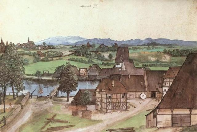 丢勒,《铜线工坊》,约1489年,纸本水彩、水粉画