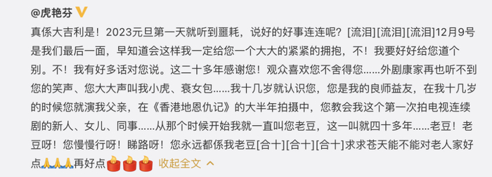 康家二嫂苏妙婵扮演者虎艳芬亦深情痛悼:“这二十多年感谢您!观众喜欢您不舍得您……《外》剧康家再也听不到您的笑声、您大大声叫我小虎、衰女包……我十几岁就认识您,您是我的良师益友,在我十几岁的时候您就演我父亲,在《香港地恩仇记》的大半年拍摄中,您教会我这个第一次拍电视连续剧的新人、女儿、同事……从那个时候开始我就一直叫您老窦,这一叫就四十多年……老窦!老窦呀!您慢慢行呀!睇路呀!您永远都係我老窦……”