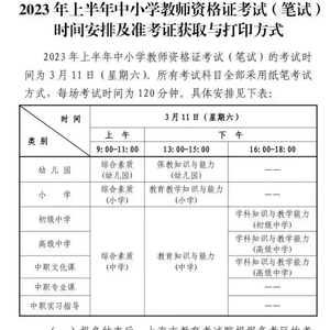 市教育考试院介绍,根据教育部、教育部教育考试院统一部署和上海市教育委员会有关文件精神,2023年上半年中小学教师资格考试(笔试)将于3月11日(星期六)举行。考试时间安排及准考证获取与打印方式见↓
