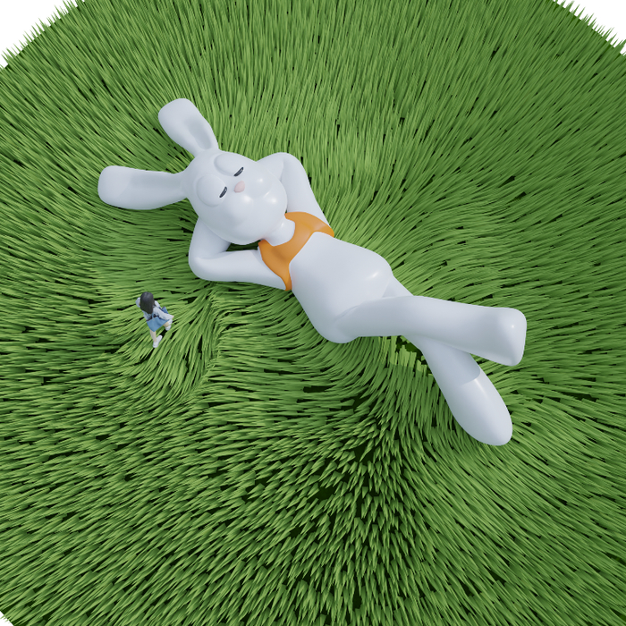 该艺术装置坐落于上海苏河湾万象天地西里的绿地草坪之上,长达12米的巨型兔宝悠哉地“躺平”在草地上,用悠闲自在的神情传递出更“Chill”的生活想象,上一秒还在承载老上海的城市记忆的慎余里流连忘返,下一秒就将坠入如梦如幻的萌兔怀中。
