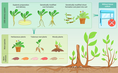 研究团队则开创性地提出了CDB(Cut-dip-budding)递送系统。该递送方法操作极其简单,并且完全不需要组织培养过程,不需要无菌条件,通过简单的植物切断(cut)-沾菌(dip)-长根后生牙(budding)操作。研究人员目前已在草本植物(橡胶草、小冠花)、块根植物(甘薯)、以及木本植物(椿树、楤木、臭茉莉)中实现了转基因或基因编辑工具的递送。