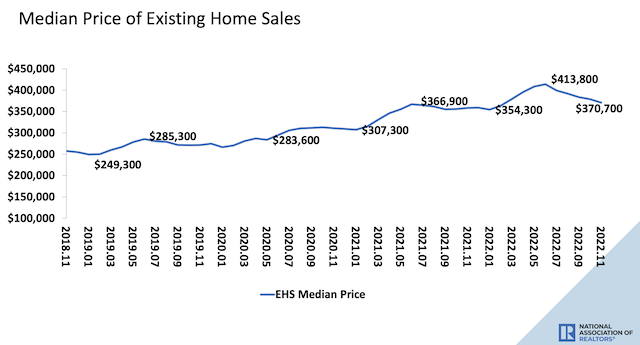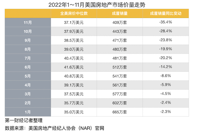 据美国房地产经纪人协会(NAR)的数据,全美房价中位数由2022年1月时的35万美元一路攀升,5月首次轻松突破40万美元,然而在6月达到峰值41.6万美元以后开始走低,至11月已连跌五个月,中位数回落至37万美元。