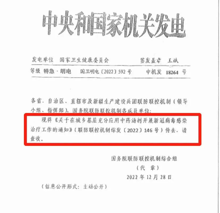 就在全世界的药厂都想来中国抢钱,各个利益阵营吵得不可开交的时候,12月28日,国家卫健委向全国印发了《关于在城乡基层充分应用中药汤济开展新冠病毒感染治疗工作的通知》,公开了治疗新冠病毒感染的中药药方。