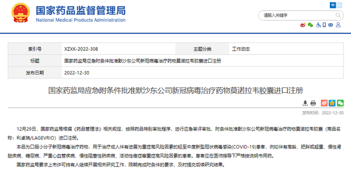 12月30日,美国制药公司默沙东旗下的抗新冠病毒口服药物,莫诺拉韦胶囊 (商品名:利卓瑞/LAGEVRIO),获得了国家药监局应急附条件批准。