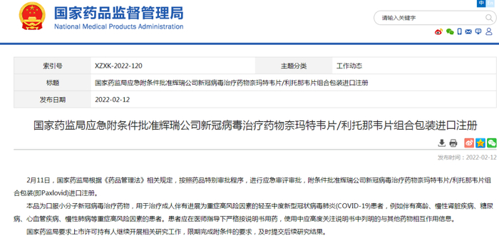 2022年2月12日,辉瑞的Paxlovid以惊人的速度撬开了中国的大门,获得了国家药品监督管理局应急附条件批准。