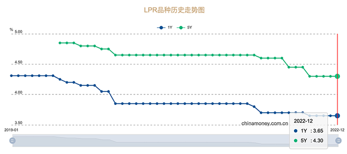 全国银行间同业拆借中心数据显示,2022年12月公布的5年期以上LPR报价为4.30%。2022年,5年期以上LPR报价一共下降了3次,累计下降了35个基点。