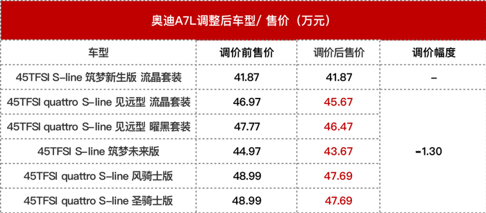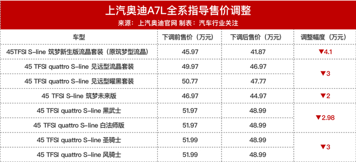 值得一提的是,三个月前上汽奥迪才降了一波价。9月初,上汽奥迪针对奥迪A7L 45TFSI车型售价进行更新,原指导售价区间为45.98-51.99万元,新指导售价区间为41.87-48.99万元,最低下调2.0万元,最高下调4.1万元。