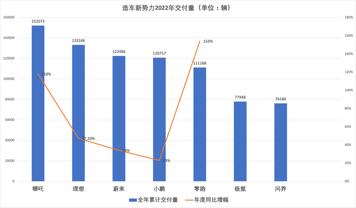 零跑2022年累计交付量达11.12万辆,同比增长超154%,在被统计的数家造车新势力中,零跑汽车获全年最高同比增幅。