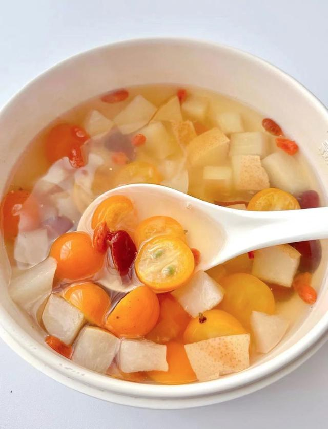 ·在锅中放入雪梨块、金桔、红枣、冰糖,加入适量的水,开小火炖煮15分钟