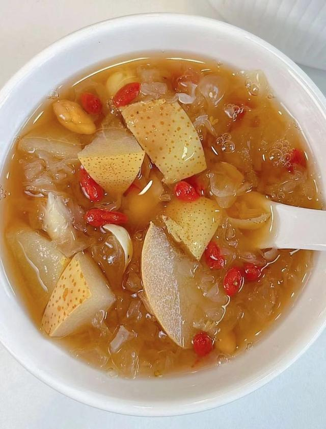 ·在锅中放入雪梨块、银耳、百合、冰糖后加入水炖煮30分钟,银耳炖煮出胶质