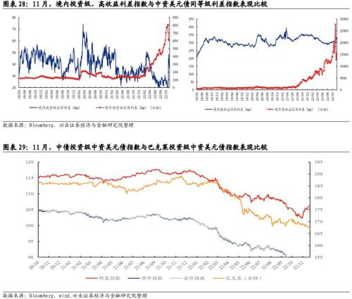 11月,各等级中资美元债指数回报率均上行。总指数中资美元债回报率、投资级中资美元债回报率和高收益中资美元债回报率分别环比上行9.17%、6.01%和32.90%。