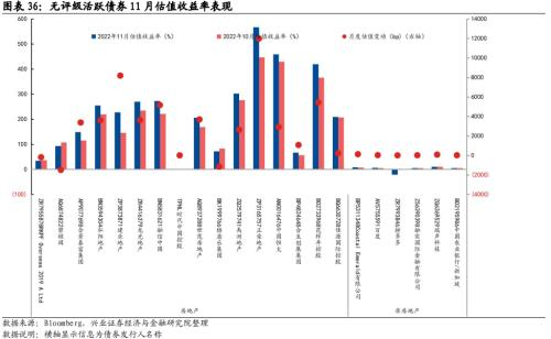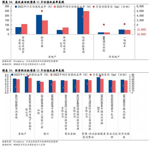 市场关注热度聚集地产。11月热度排名前15的中资美元债发行企业中房企占比超六成。除了房地产行业,财产及意外险、运输与物流、化工产品、金融服务和银行也是市场热度较高的中资美元债关注行业。而从活跃券表现来看,11月中资美元债活跃券的估值收益率大多环比上行。其中,投资级活跃个债的估值波动区间较小,无评级活跃债券的估值波动区间相对较大。