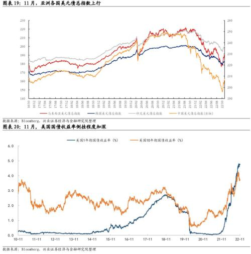 11月美债短端收益率上行,长端收益率下行,美国国债收益率倒挂程度加深。短端的1年期美国国债收益率从10月底的4.66%上行至11月底的4.74%,上行8BP;长端10年期美国国债收益率从10月底的4.10%下行至11月底的3.68%,下行42BP。