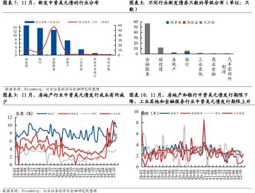 净融资规模为负,城投债、银行和金融服务成为发行主力。从行业分布来看,城投债、银行和金融服务行业11月的发行规模位居前三。从具体行业来看,11月共有3只房地产中资美元债发行,分属于2个发行主体,发行规模为7.46亿美元,环比有所上升(上月发行规模为1.19亿美元)。银行业发行6只中资美元债,环比有所减少;城投平台共发行12只中资美元债,发行数目比上月增加。
