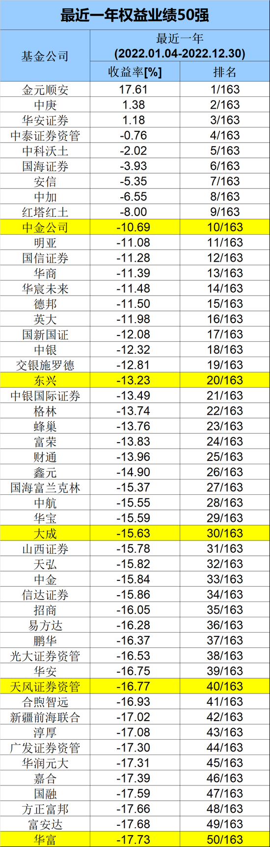数据显示,从2022年1月4日至12月30日表现最好的是金元顺安,业绩达到17.61%,排名第一。紧随其后是中庚基金,最近1年收益为1.38%。此外,华安证券也以1.18%的收益率位居第三。而中泰证券资管、中科沃土、国海证券、安信、中加等公司业绩也不俗。