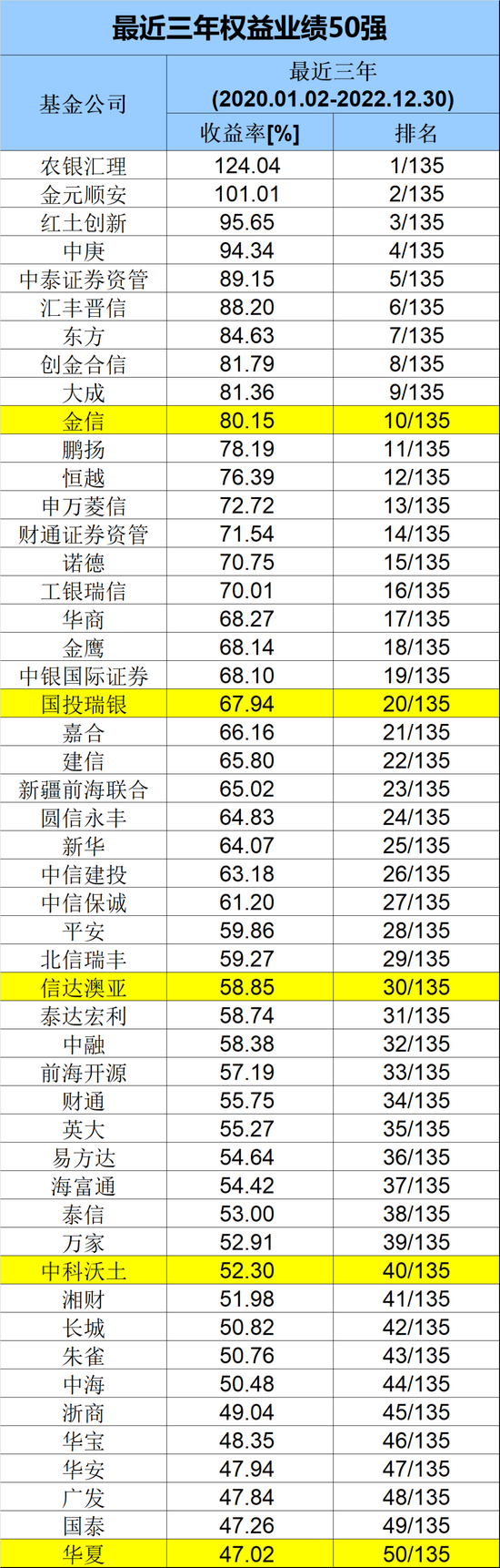 从3年期(2020年1月2日到2022年12月30日)绝对收益排名看,三年期冠军为农银汇理,旗下权益类基金平均收益率达到124.04%,在135家公司中排名第一,该公司在最近5年的业绩也不俗,显然是较好的抓住了市场机遇。
