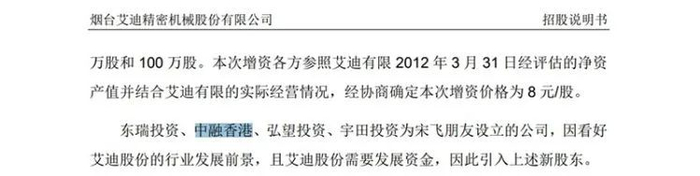 原始股东中,有个股东叫中融(香港)投资有限公司(简称“中融香港”)。据招股书披露,2012年8月,中融香港以2800万元的价格增资入股艾迪精密。据描述,中融香港等系公司实控人宋飞朋友设立的公司,因看好公司的行业发展前景,且公司需要发展资金,因此引入上述新股东。