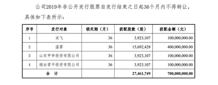 2019年12月,艾迪精密完成7亿元定增事项,认购对象共4名。其中,公司实控人之一宋飞认购1亿元,君平投资、甲申投资各认购了1亿元,温雷一人掏出4亿元,对朋友可谓信任至极。