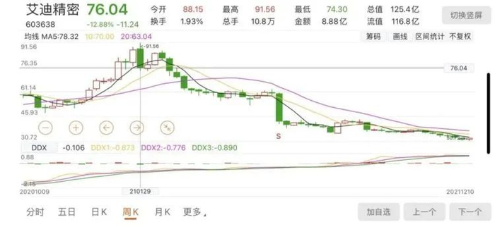 有了再融资资金助力,艾迪精密经营业绩稳步提升,股价螺旋式上升,2021年初盘中股价一度摸高91元,温雷家族持股市值最高达44亿元。但最近两年,公司股价整体呈下行态势,温雷家族最新持股市值又回落至约10亿。