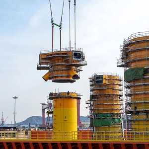 据“海油观澜号”海油工程项目经理华斌介绍,该项目采用多点系泊的方式固定风电平台,部分利用了原有浮式生产储卸油装置(FPSO)的系泊系统,并且还在国内首次采用了在线张紧器等创新技术,以此来提供稳定的锚泊固定,极端天气下在水平位移达到33.8米时仍可牢固系泊。