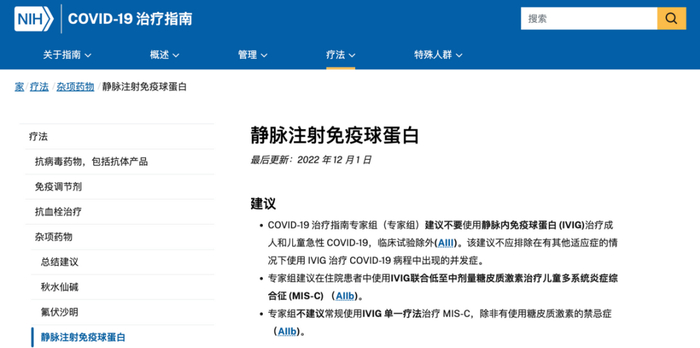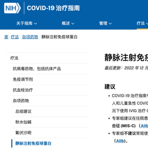 据人民日报健康客户端援引美国国立卫生研究院COVID-19治疗指南专家组建议,不要使用静注人免疫球蛋白(IVIG)治疗成人和儿童急性COVID-19(临床试验除外)。该建议不排除在有其他适应症的情况下使用IVIG治疗 COVID-19 病程中出现的并发症。2021年11月,发布于《柳叶刀呼吸医学》杂志的研究“COVID-19相关中度至重度急性呼吸窘迫综合征患者的静脉注射免疫球蛋白:多中心、双盲、安慰剂对照的3期试验”显示,在接受有创机械通气的COVID-19相关中度至重度急性呼吸窘迫综合征患者中,静注人免疫球蛋白(IVIG)并未显著改善预后,而且往往与更多不良事件相关。