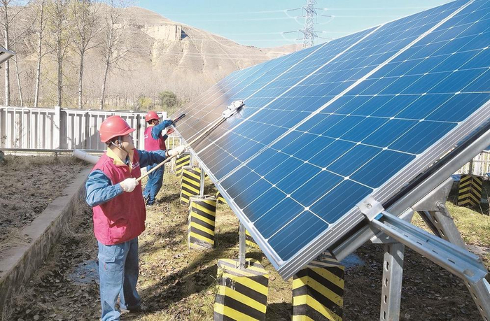 国家电网青海电力三江源(海东)共产党员服务队清扫检查班彦村光储一体化污水处理系统中的光伏设备。
