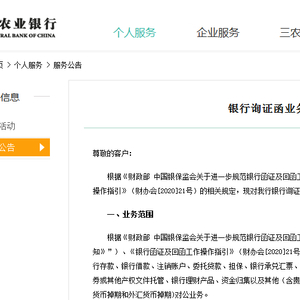 根据《财政部 中国银保监会关于进一步规范银行函证及回函工作的通知》(财会[2020]12号)、《银行函证及回函工作操作指引》(财办会[2020]21号)的相关规定,现对我行银行询证函业务服务相关事项公示如下: