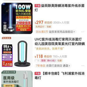 即使在同一家店铺内,销售的紫外线家庭消毒器也有较大区别。在某店铺内,店家根据功率的不同,分为38w、65w、100w、150w四个段位,每个段位又分有无臭氧功能,价格最便宜的38w只需299元,而号称能够达到100%的除螨率和99.99%的杀菌率150w的紫外线消毒灯,价格则达到了629元。