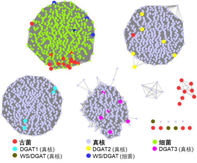 图DGAT同工酶在细菌、真核及古菌域中的序列相似性网络分布图