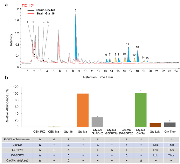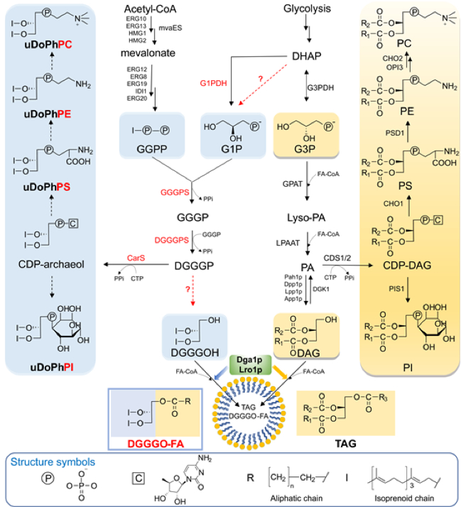 在之前的研究中,科学家们基于脂质体(liposome)、细菌等构建了兼具G1P和G3P的杂合膜脂模型,但尚未成功构建真核-古菌杂合模型,以更直接地研究真核膜脂起源的问题。中国科学院深圳先进技术研究院司同课题组与南方科技大学张传伦教授课题组合作,在国际学术期刊Angewandte Chemie International Edition发表研究论文 Biosynthesis of Hybrid Neutral Lipids with Archaeal and Eukaryotic Characteristics in Engineered Saccharomyces cerevisiae。