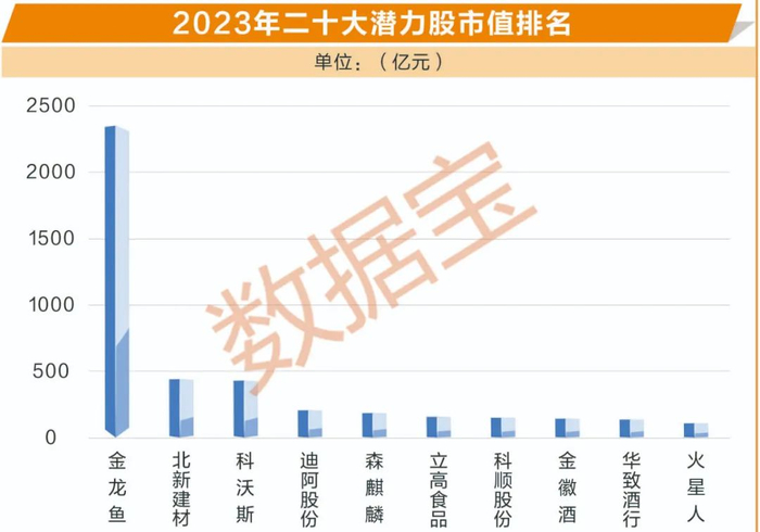 从市值角度看,市值最大的是金龙鱼,超过2300亿元。此外,建材龙头北新建材、扫地机器人龙头科沃斯、珠宝首饰龙头迪阿股份等个股市值均超200亿元。