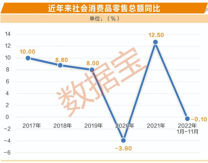 国家统计局数据显示,2022年11月份社会消费品零售总额38615亿元,同比下降5.9%。其中,除汽车以外的消费品零售额34828亿元,下降6.1%。总体来看,2022年1月~11月社会消费品零售总额同比下降0.1%。继2020年后,2022年较大可能全年社会消费品零售总额再度出现同比下降。
