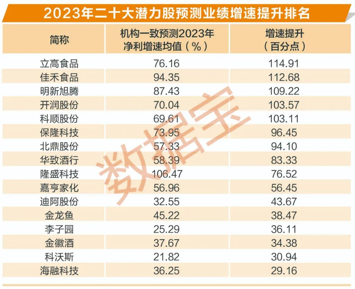 具体来看,机构一致预测隆盛科技2023年净利增速超过106%,相比2022年提升近77个百分点。另外佳禾食品、明新旭腾、立高食品、保隆科技、开润股份等个股机构一致预测2023年净利增速均超70%。从净利增速提升情况来看,机构一致预测立高食品、佳禾食品、明新旭腾、开润股份、科顺股份等个股2023年净利增速相比2022年提升均超100个百分点。