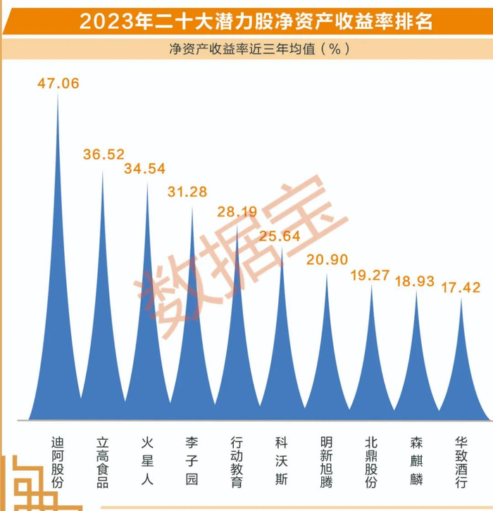 整体而言,二十大潜力股多为盈利能力较好的白马股。数据宝统计,二十大潜力股2019年至2021年净资产收益率平均值的中位数超17%,大幅超出A股整体水平。潜力股中,迪阿股份、立高食品、火星人等7只个股三年净资产收益率平均值超过20%。