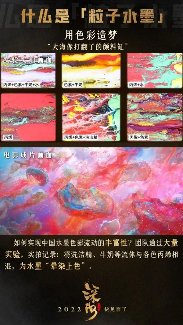 从2020年《姜子牙》片尾彩蛋里见到它的片花的那一刻起,《深海》的质感就让人一见难忘,美轮美奂的国风3D效果堪称极致。影片一反大众对深海的“幽暗”认知,而是以融合上百种色彩的水墨国画作为美术概念,海水如玻璃糖纸般五彩斑斓,对光影和色彩的运用颇为大胆,扑面而来的梦幻感和想象力着实惊艳。唯美的画面利用三维技术立体呈现,是难得一见的动画技术。上世纪,中国的二维水墨动画曾惊艳世界,而此番,为打造“前所未见”的大银幕奇观,主创耗时两年开创性研发“粒子水墨动画”,实现中国水墨与主流三维技术的结合。预告中单帧画面粒子数高达1-2亿、仅单帧渲染就需1小时。
