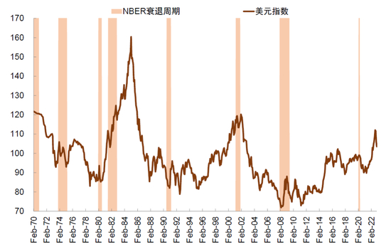 图表38:衰退期间美元往往走强,美元趋势性拐点或待下半年