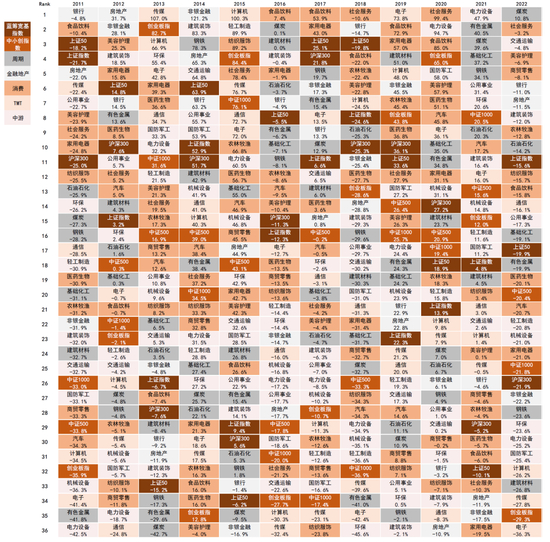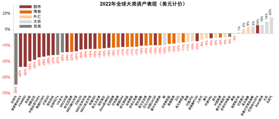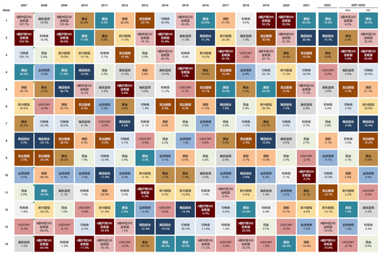 图表40:全球历年大类资产轮动的表现:2022年原油和大宗商品表现最好