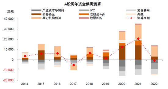 内外因素综合影响引发回调。2022年A股表现总体低于市场年初的预期,主要由内外因素综合导致,内因可能更为主导。内部的基本面方面,年初房地产在传统稳需求政策支持下并无起色,下半年房企信用风险引发地产销量二次探底,对经济产生较大拖累;另一方面局部疫情频繁发生也导致防疫难度加大,拖累经济呈现供需双弱的特征。海外方面,通胀居高不下引发持续紧缩,俄乌冲突加剧通胀粘性和地缘风险升温,而且海外衰退预期也对外需产生明显拖累。在内外综合因素影响下,尽管国内宏观流动性相对充裕,无风险利率整体下行,但由于基本面下行压力较大,以及多重压制因素导致市场风险偏好下降,风险溢价大幅走高,最终引发全年市场跌幅较大且估值跌至历史相对低位。