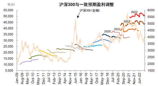 资料来源:朝阳永续,中金公司研究部;注:各年份为万得的沪深300盈利预期
