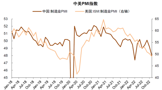 图表4:美国制造业PMI不断下行,中国制造业PMI低位振荡
