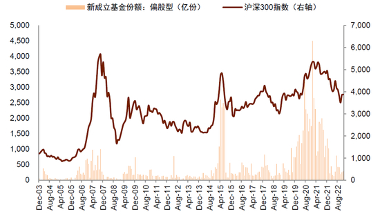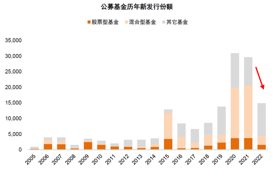 2022年公募基金新成立份额整体遇冷。2022年全年公募资金发行1.4万亿份,低于去年2.9万亿份水平,而且受到2022年股票市场调整和相比2019-2021年财富效应下降的影响,2022年偏股型基金发行规模约为0.47万亿份,相比2021年2.17万亿份下降更明显。从配置层面,尽管2022年市场波动幅度较大,但公募基金整体配置仓位维持较高水平,公募基金对前二十大重仓股的持股集中度已下降至31%,显示对于非龙头的中小盘股配置有所增加;但是行业层面的配置主要仍集中于白酒、新能源汽车产业链和光伏产业链等热门赛道。但我们预计伴随各类财富管理和资产管理机构发展壮大,以及房地产等实物资产吸引力边际下降,居民增配金融资产的中长期趋势有望延续,有望带动公募基金发行回暖。