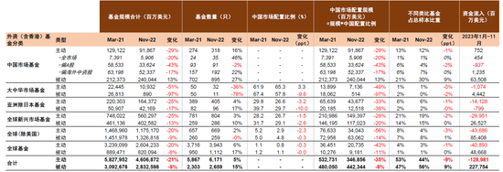 2022年外资资金波动明显。2022年受内外因素综合影响,国内基本面下行压力加大,海外政策紧缩和地缘风险扰动,外资对A股的流向一改过去相对稳定的局面。2022年北上资金波动整体加大,全年累计净流入900亿元,与2021年累计净流入4321亿元相比明显下降,其中2022年3月和2022年7-10月北向资金出现较大规模的净流出。截至2022年9月,境外投资者持有境内股票资产为3万亿元,较2021年底减少0.9万亿元左右。